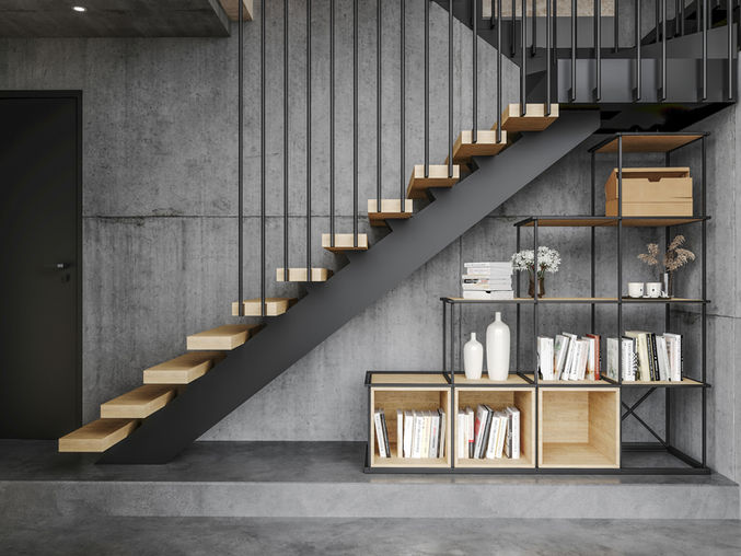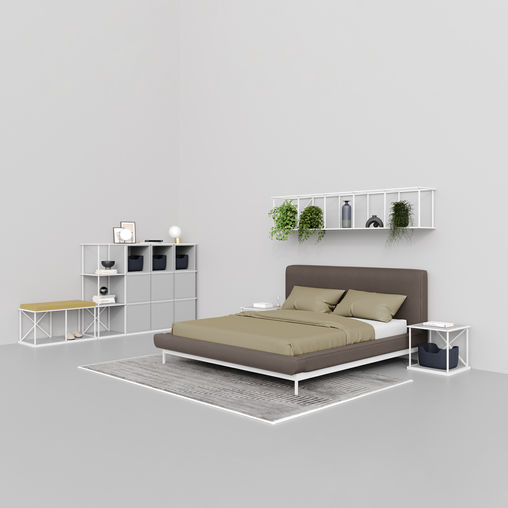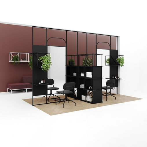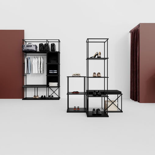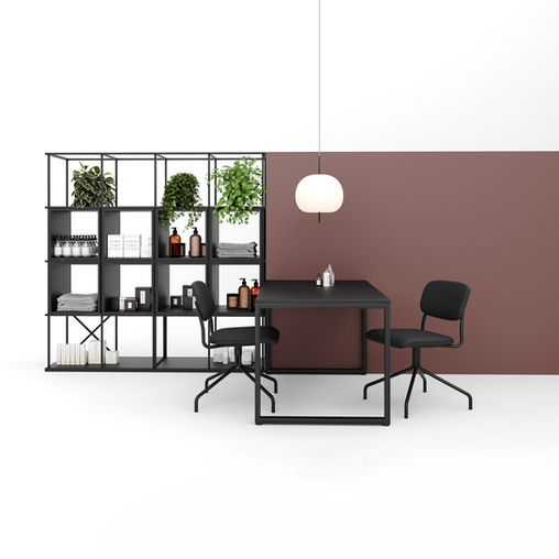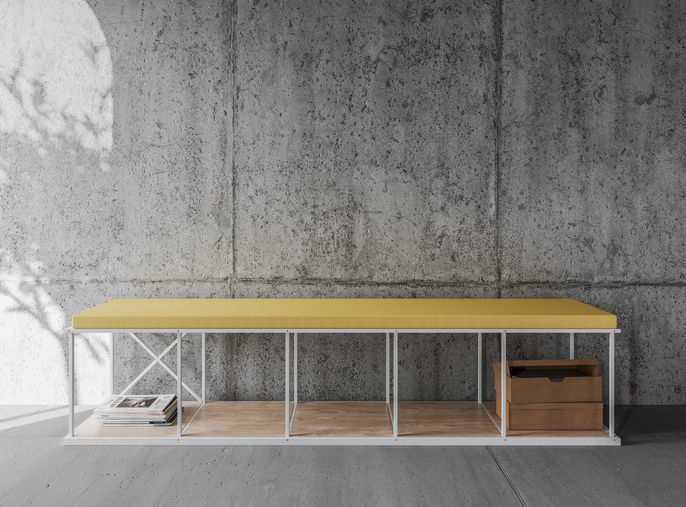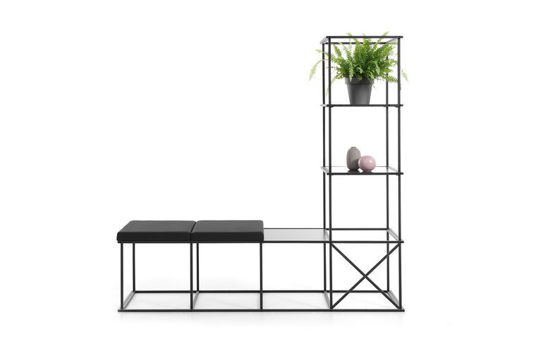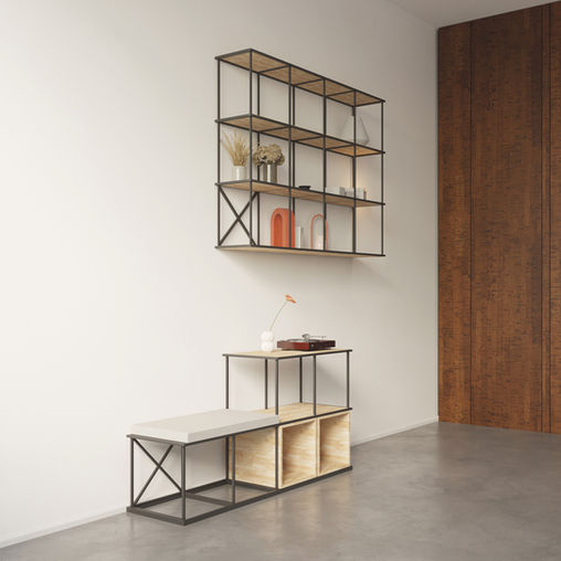 Ein System industrieller Bücherregale mit geometrischem Aufbau, das mit Sitzen, Regalen und anderem Zubehör variiert werden kann. Diese Elemente verändern die Funktion des Möbels und geben ihm eine einzigartige Form.